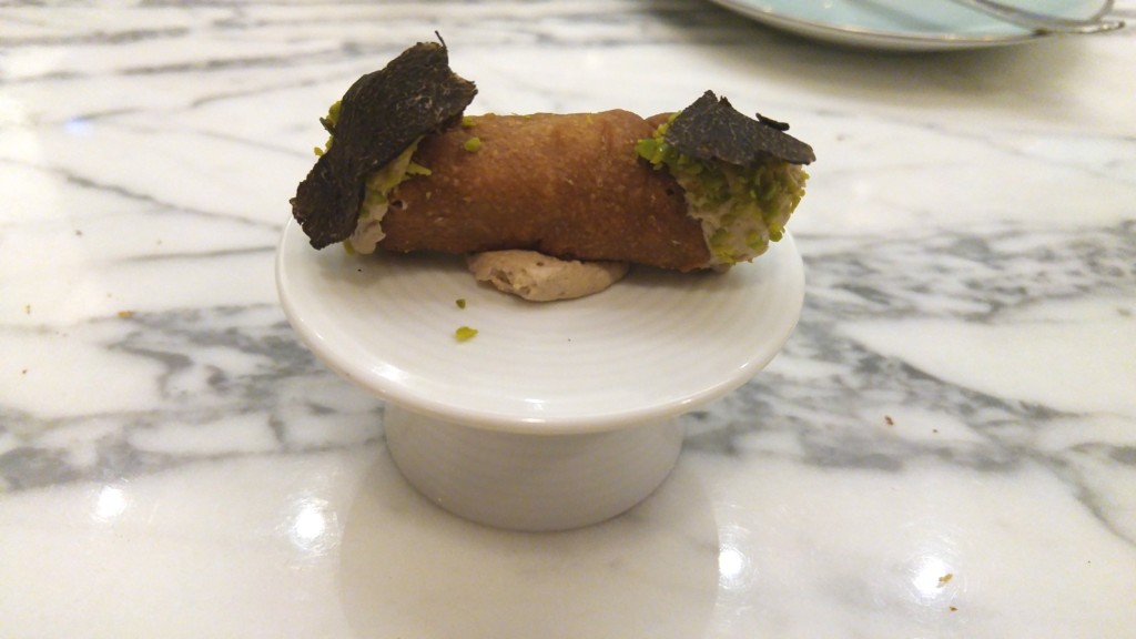 Keep in mind that with lavish bread service, an opening amuse-bouche, between course bites, and a pre-dessert palate cleanser, even a 3-course meal offers plenty more. During a recent visit, one such added nibble was actually the show stopper of an evening filled with them — the “Foie-Noli”. This mini cannoli was filled with a foie gras mousse, and adorned with black truffle shavings and pistachio crumble for a heavenly bite.