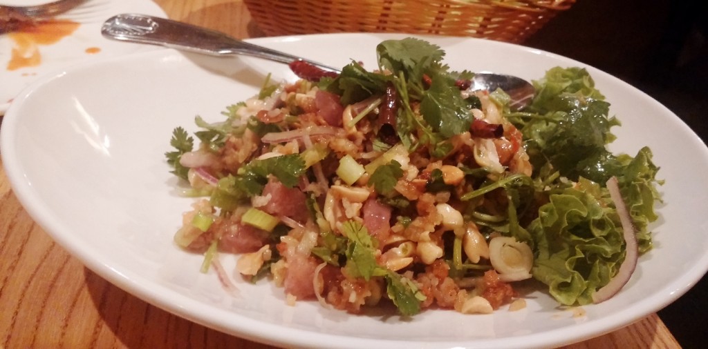 The menu features an array of noodles, rice dishes, soups and curries. Don’t pass up on the Naem Khao salad (featured photo above), one of the restaurant’s signature dishes, with small chunks of crispy rice bits, pork, coconut, lime, peanuts, cilantro and chile. It’s meant to be rolled up in lettuce wraps, but you could ditch the wraps and eat it by the fork full, it’s that good.