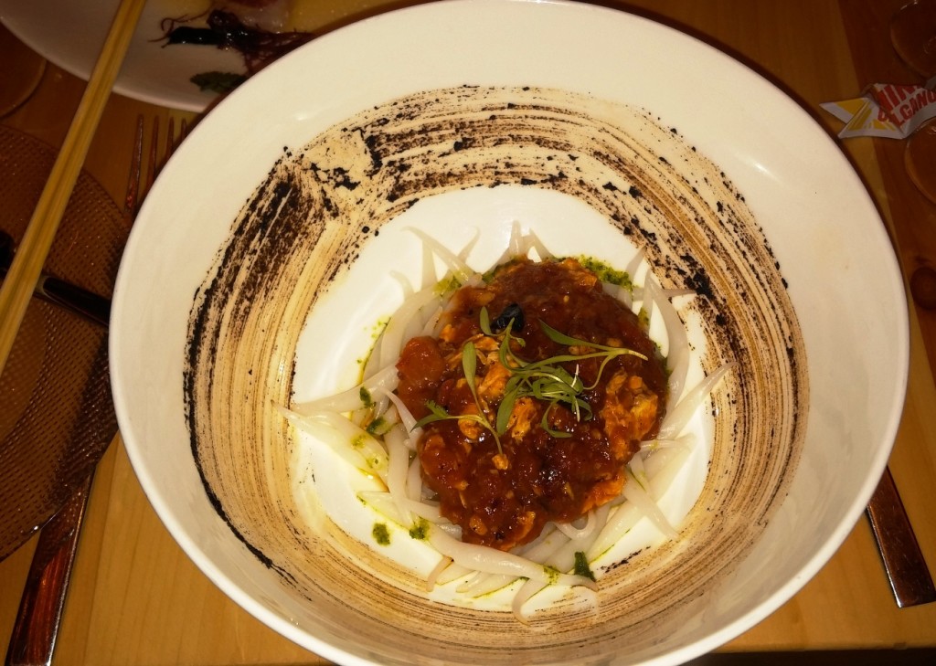 The menu is broken down accordingly. There’s a dim sum section, chaufas and tallarines – fried rice and noodles, piqueos, or small snacks for the table, ceviche, sashimi and nigiri, soups, salads and vegetables, and additional portions of the menu such as “The Chinese Connection” and “Peruvian to the Bone.” Most dishes are meant to be shared, so plan on perhaps four to six for two people.