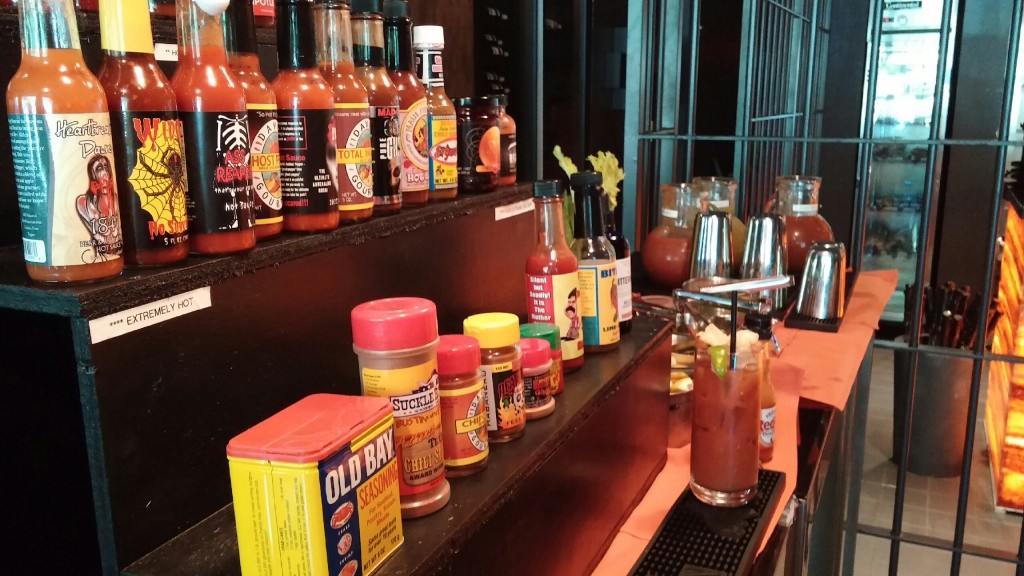 You have your choice of vodka or tequila (for a Bloody Maria, of course), as well as three house-made mixers; tomato, spicy tomato, and a tomatillo mix. Then, select from several dozen hot sauces and seasonings, as well as every topping you could imagine — bacon, shrimp, crunchy chicharrones, olives, pickles, lemon and lime, celery, asparagus and more. Be as traditional, or as creative or absurd, as you dare.