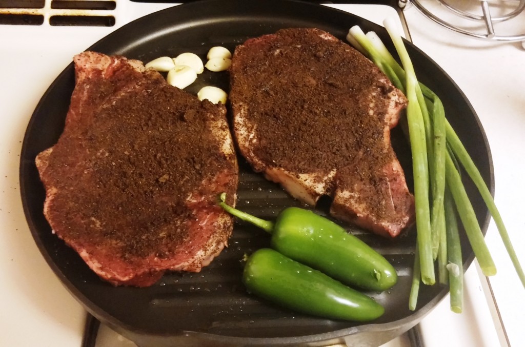 This is actually a grilled recipe, but we used a grill pan indoors, and we made the recipe for two rather than for four. Make the simple coffee chocolate rub, which looks fantastic smeared over the steaks. Get them going on the grill along with jalapenos, garlic and scallions.